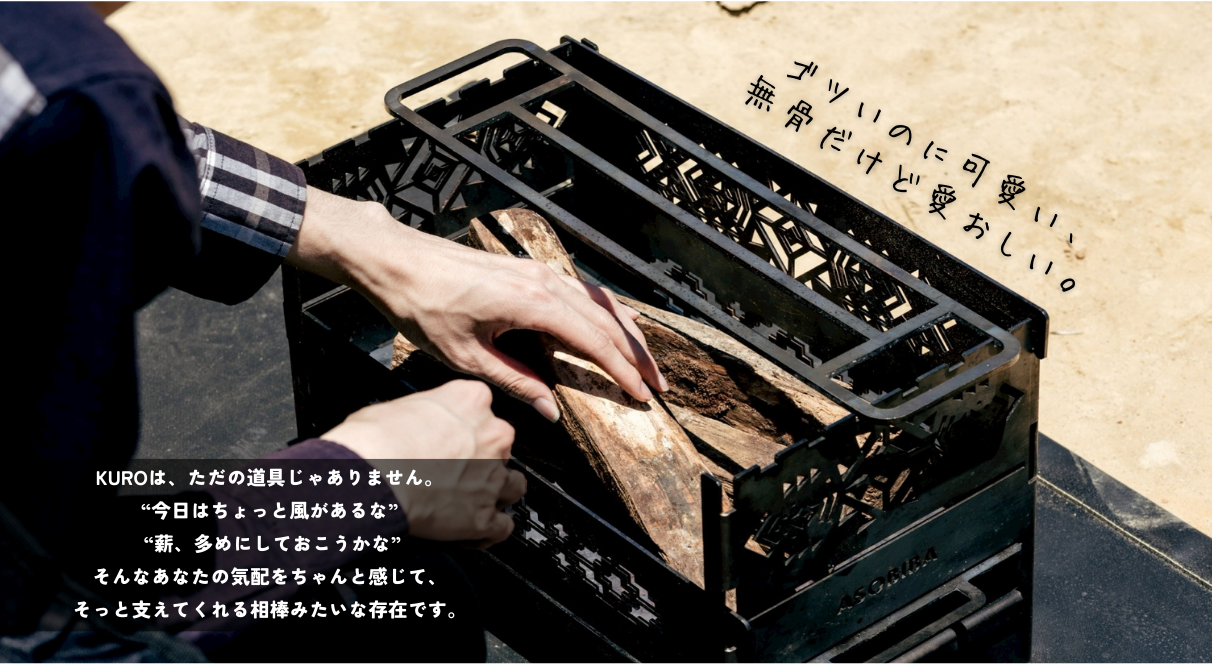 ソロキャンプに、“KURO”という名の小さな相棒を。 焚き火をもっと身近に、もっと自由に。 黒皮鉄(SS400)のマットな質感に、手に取ってわかるしっかりボディ。 6.5kgの重さも頼もしさの証。火を囲むその時間に、そっと寄り添ってくれるのがこの子、KUROです。 サイズは370×240×210mm。中は広々、薪は切らずにそのままポン。 内寸350×145×200mmだから、キャンプ初心者さんにもやさしい仕様。 付属の五徳(400mm)で、焼く・煮る・あそぶ、思いのままに。 KURO、3つの進化ポイント 〇 タフで、でも優しい。 板厚2.3mm、重さ6.5kgにパワーアップ。風にもビクともしない頼もしさで、どんな焚き火も安定サポート。 〇 “ズボラ”に寄り添う、やさしい工夫。 薪スペースは35cmに拡張。「切るのめんどう…」そんな声にもちゃんと応えてくれる設計です。KUROは、がんばりすぎなくていいキャンプを応援します。 〇 収納袋にも、ちょっといいこだわり。 キャンプ帰りもスマートに。主婦目線でつくられたオリジナルバッグは、洗いやすくて立てて置けて、見た目も◎。 KUROのことば 「火を囲む時間って、ちょっとだけ自分に優しくなれる時間。 気持ちに余裕があると、焚き火ももっと楽しくなるんだよ。」 KUROは、ただの道具じゃありません。 “今日はちょっと風があるな” “薪、多めにしておこうかな”――そんなあなたの気配をちゃんと感じて、そっと支えてくれる存在です。 今夜の焚き火が、あなたらしくいられるひとときになりますように。